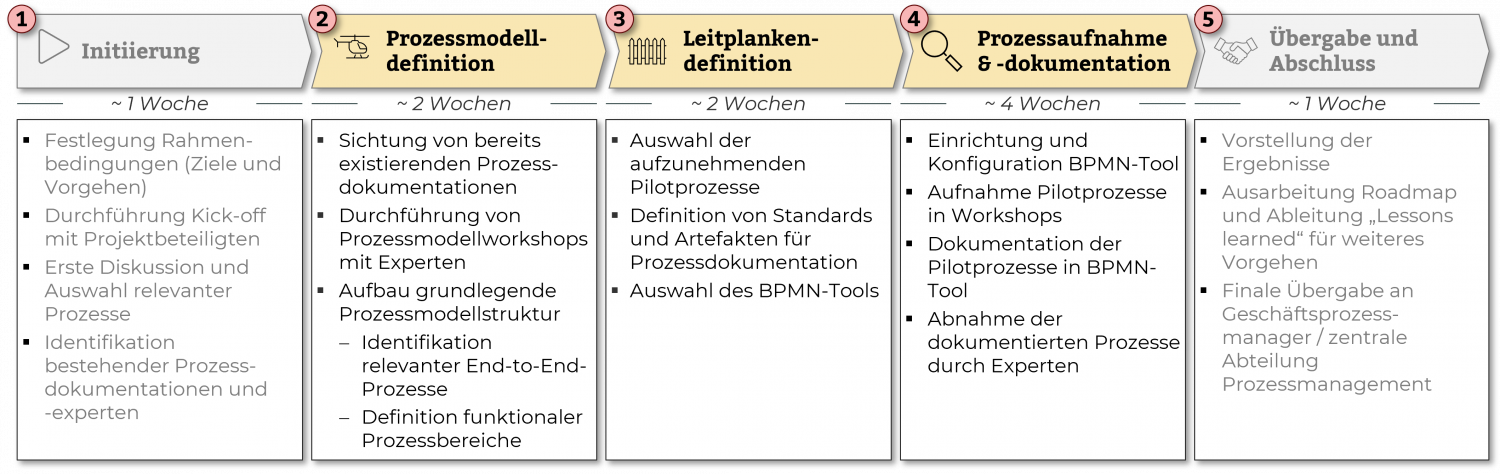 Die Grundlage für die anschließende Prozessaufnahme und -dokumentation bilden Leitplanken für die zu nutzenden Standards, Artefakte und Tools, die gemeinsam festgelegt werden.