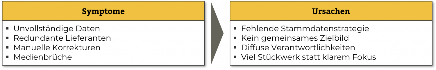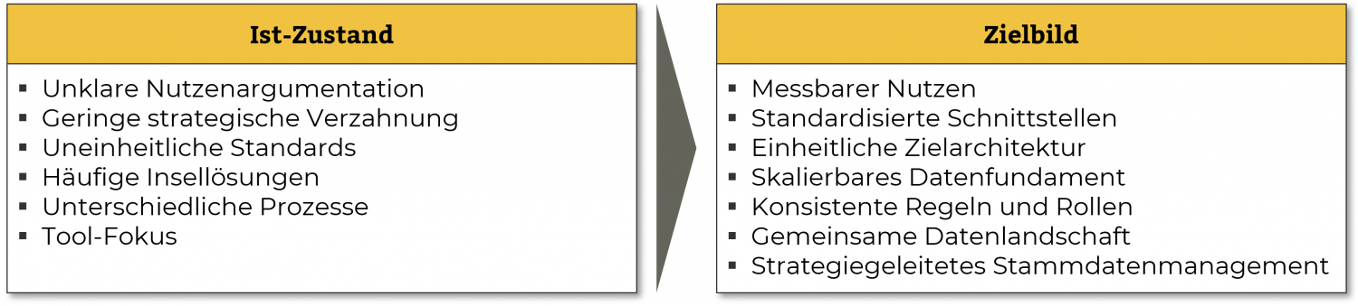 - Stammdatenmanagement: die organisatorische und prozessuale Umsetzung entlang von Rollen, Verantwortlichkeiten und Systemen