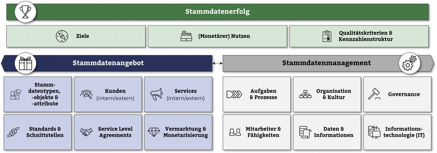 - Stammdatenangebot: das interne und externe Leistungsportfolio rund um Stammdatentypen, Stammdatenservices, Standards, Service Level Agreements und Monetarisierungsoptionen